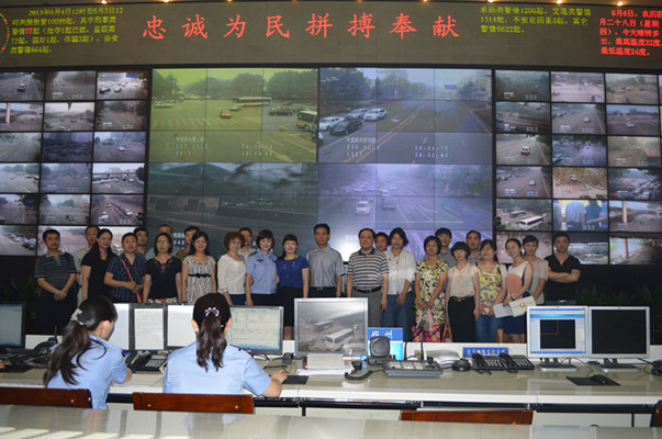 接著大家來到鐫刻有“忠誠(chéng)為民、拼搏奉獻(xiàn)”字樣的全市交通路況顯示屏前。大屏幕上顯示著鄭州市各個(gè)主要單位、部位和重要道路交叉路口的即時(shí)信息,具有GPS定位功能的警車在不停地移動(dòng),視頻畫面依序切換,“原來每時(shí)每刻都有幾百輛警車在街面巡邏,每個(gè)路口都有監(jiān)控??礃幼?,鄭州市的安保工作還是有保障的,以后更要規(guī)范自己的言行,遵守交通規(guī)則”大家很是感慨。