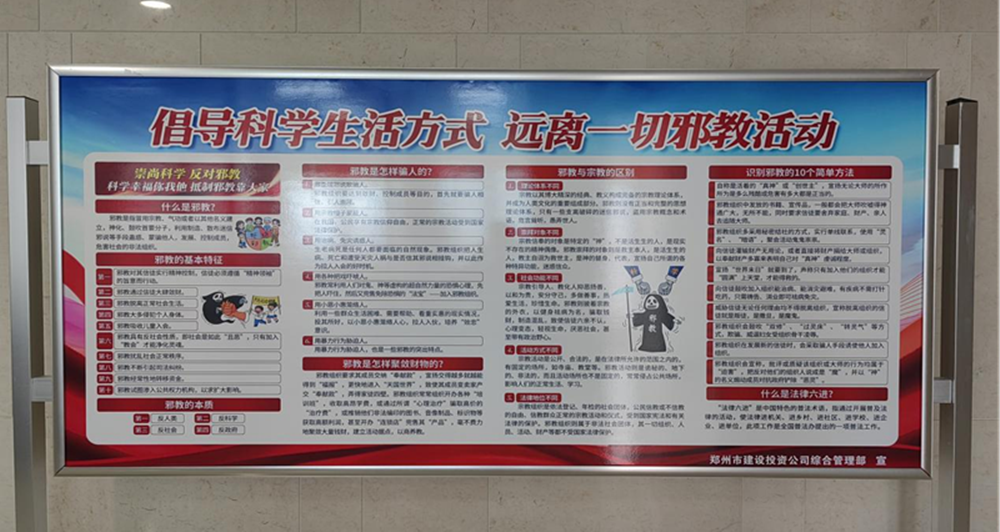 為了進(jìn)一步提高國企員工反邪教意識,認(rèn)識邪教的危害,切實增強自覺抵御邪教侵蝕的能力,營造積極向上、健康和諧的工作氛圍。4月25日下午,鄭州市建設(shè)投資集團(tuán)有限公司組織全體干部員工開展反對邪教宣傳活動。利用PPT宣講、宣傳展板、網(wǎng)站、懸掛橫幅等方式,向員工宣傳邪教的種類、危害和邪教組織的種類等,引導(dǎo)國企干部職工認(rèn)清邪教本質(zhì),提高識邪、防邪、拒邪能力,筑牢反邪教思想防線,做到對邪教歪理邪說不聽、不看、不信、不傳。